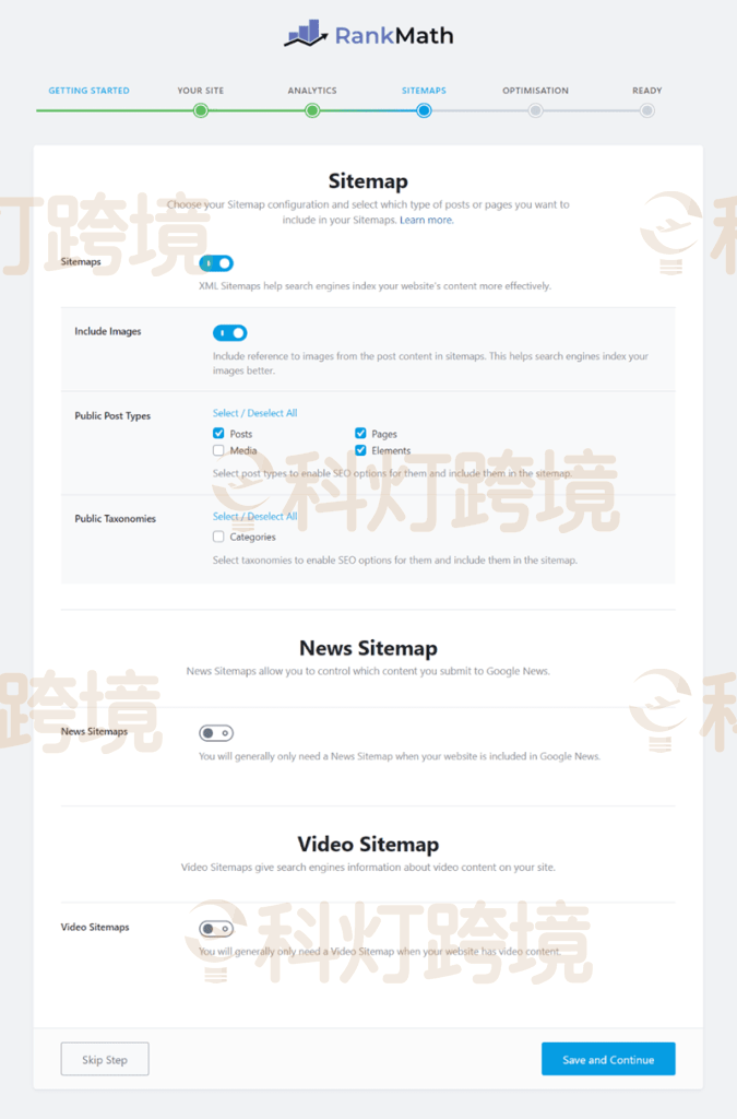 3、站点地图设置,根据图片进行开启和勾选即可,站点地图包含图片、文章、页面、产品和产品分类,新闻和视频站点地图,外贸独立站一般不需要开启,下一步。