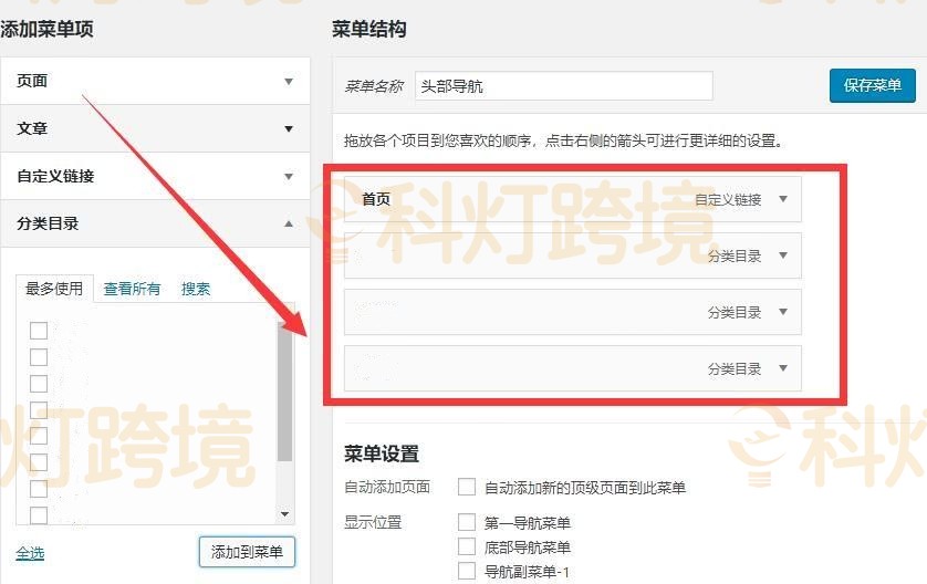然后点击“添加到菜单”按钮,这几个分类目录名就添加到右侧的空菜单中了,如下图: