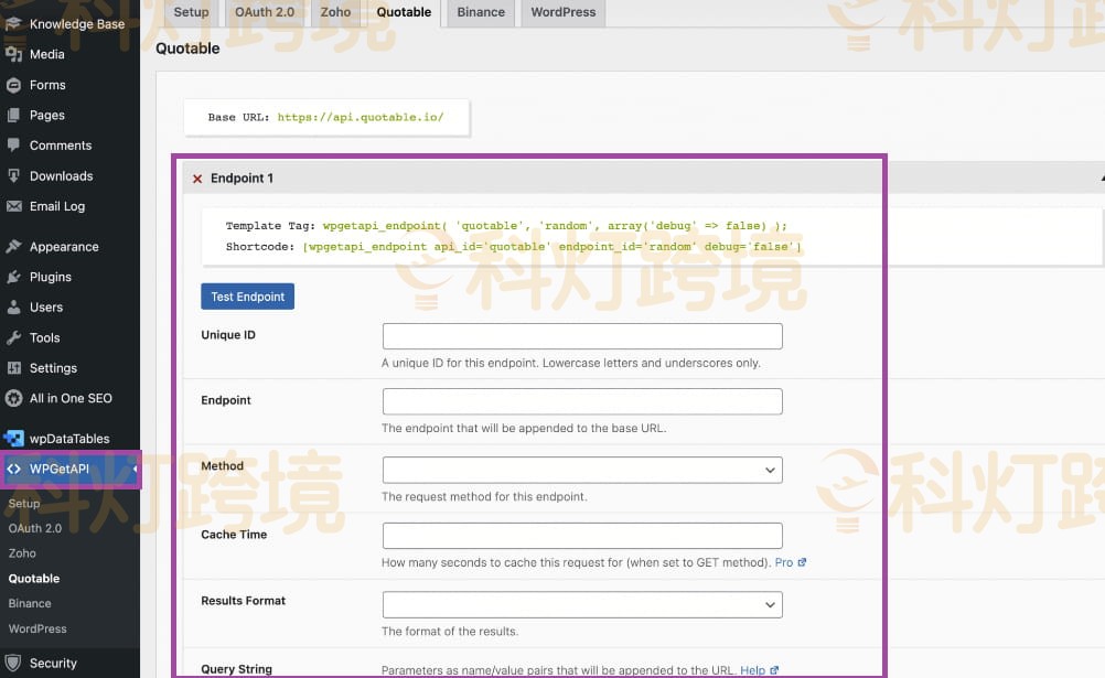 可以在API的文档中轻松找到成功集成所需的端点。保存API名称、唯一ID和基本URL后,必须配置终结点,WPGetAPI插件将向用户显示一个表单,要求提供API的端点详细信息。