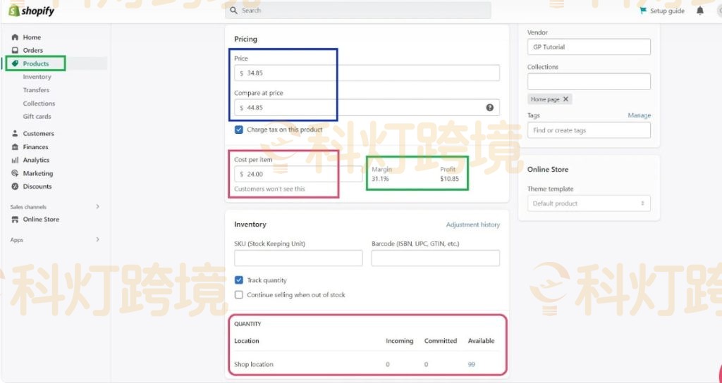 定价:在“价格”和“原价比较”下添加商品的售价,以显示原价和售价之间的差异,“每件商品的成本”将计算毛利率。
