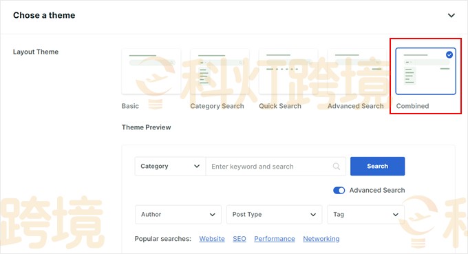 现在可以向下滚动到 ‘自定义样式’ 部分并选择 ‘类别搜索’ 和 ‘高级搜索’ 选项,这可确保表单包含所有筛选功能。